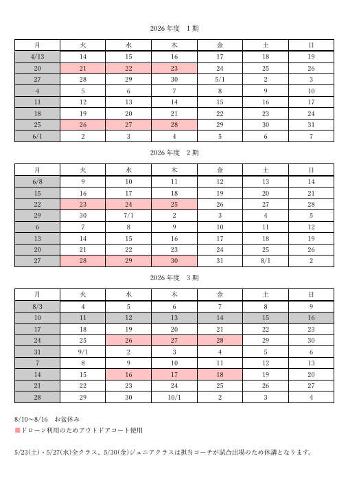 スクール 2026年3月31日 by admin SAKAI RESTA(サカイ リスタ)では、境町アーバンスポーツパーク内の『SAKAI Tennis court2020』を使用して、本格的なテニスレッスンを提供いたします。 タイムテーブル 料金表(税込) 年間スケジュール
